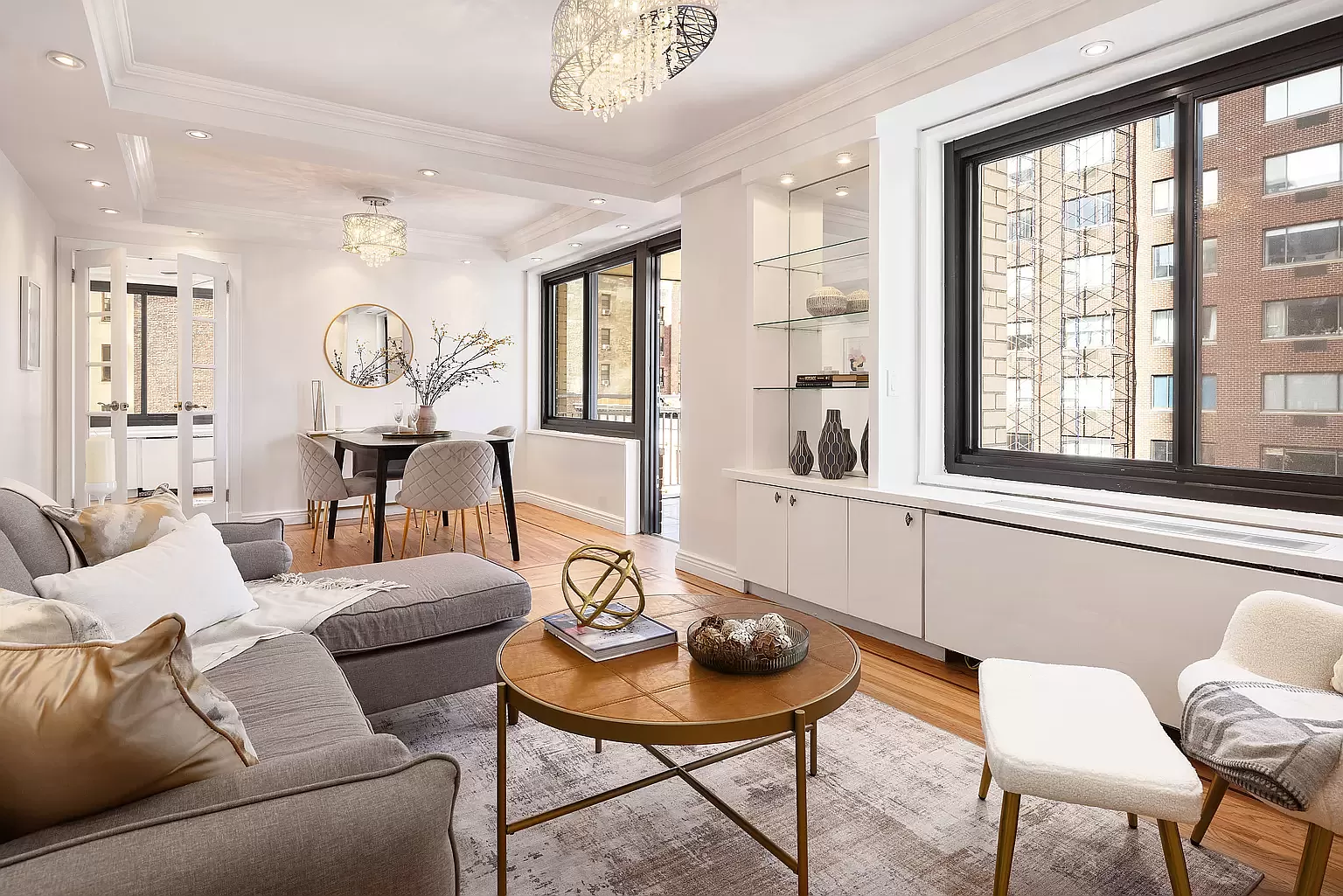 The main living area has an open layout and is expansive, with ample room for dining and entertaining. It is graced with a wall of windows that lighten the space. Egress from this lounging area to your own private balcony with lovely views of luscious green treetops and ornate buildings.