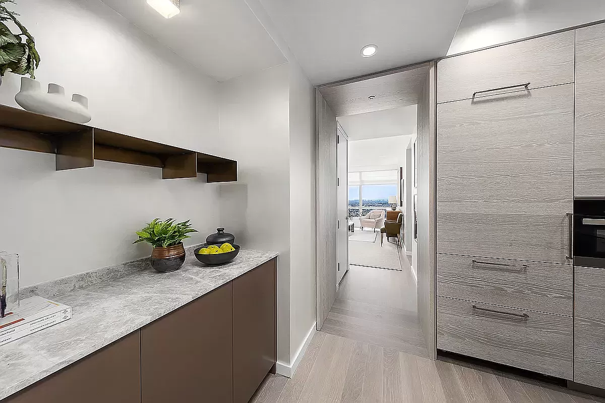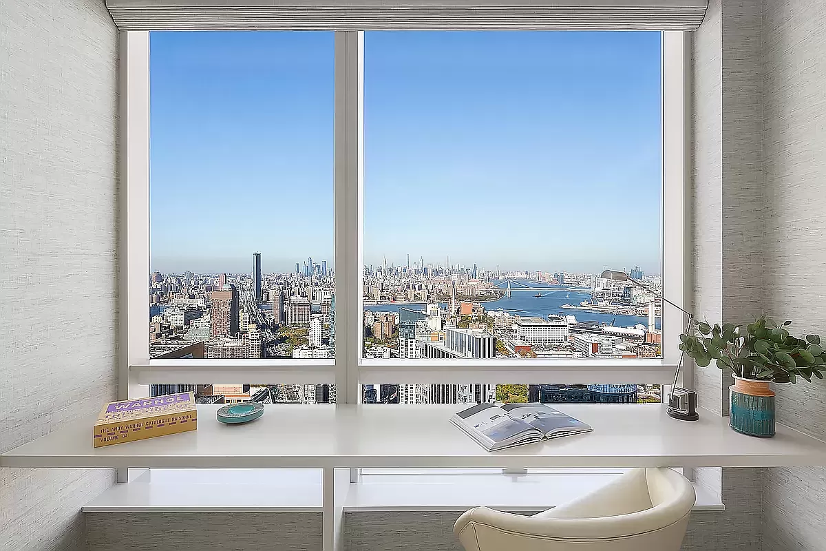 46J is a stunning one bedroom home with oversized windows and bright, northern exposure. Features of this 768 sq. ft. home include beautiful wide plank oak floors, floor-to-ceiling windows with panoramic views of Brooklyn, A kitchen featuring cerused oak cabinetry, white quartz countertops, and Miele appliances including a 4-burner gas range, 30" refrigerator, and speed oven..The spa-like master bathroom, with radiant floor heating, features Oro Puro quartz tile flooring and walls with a marble mosaic feature walls, a custom sink Bianco Carrara marble vanity, recessed medicine cabinets with integrated outlets, and custom makeup mirror.